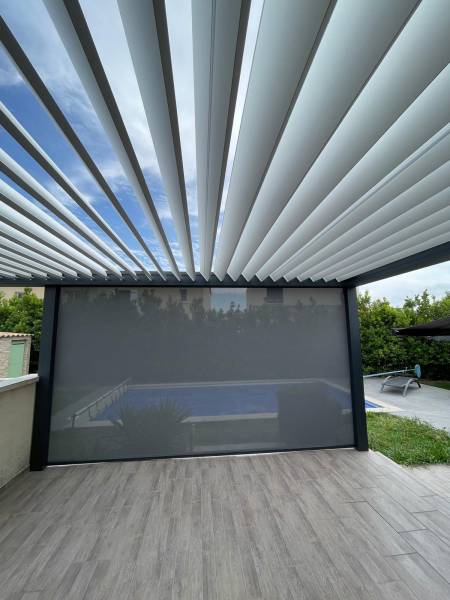 L’installation est complétée par un store Zip Screen intégré sur l’un des côtés, idéal pour se protéger du vent, du soleil rasant ou préserver son intimité, sans compromettre la vue vers l’extérieur. Un éclairage LED dans les lames assure une ambiance douce et confortable une fois la nuit tombée.