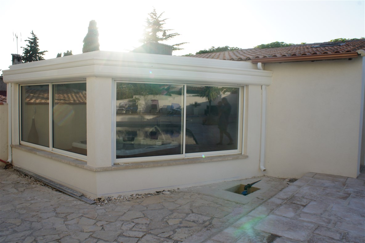 La toiture de cette véranda est plate, le cheneau dissimule des volets roulants pour une protection optimale.