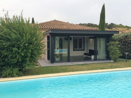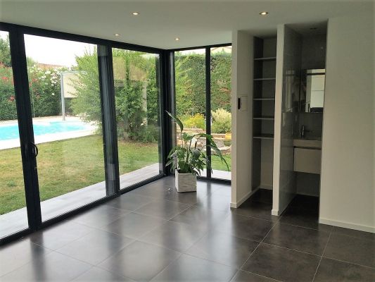 Cette extension à toit plat, installée par l’équipe de poseurs qualifiés d'Alu Vigouroux, dispose d'une isolation phonique et thermique exceptionnelle sur le marché de la véranda aluminium de R= 9.36 !