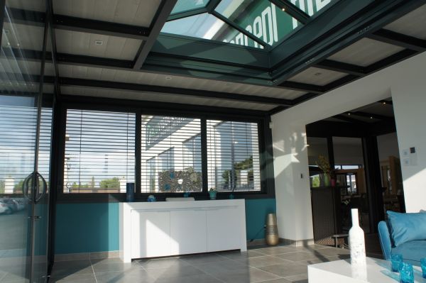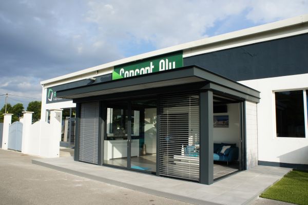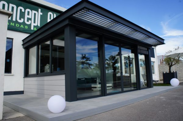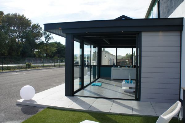 Visible dans notre hall d'exposition à Marignane, cette véranda en aluminium gris 7016 structuré est présentée dans une version originale Arty avec des poutres apparentes.