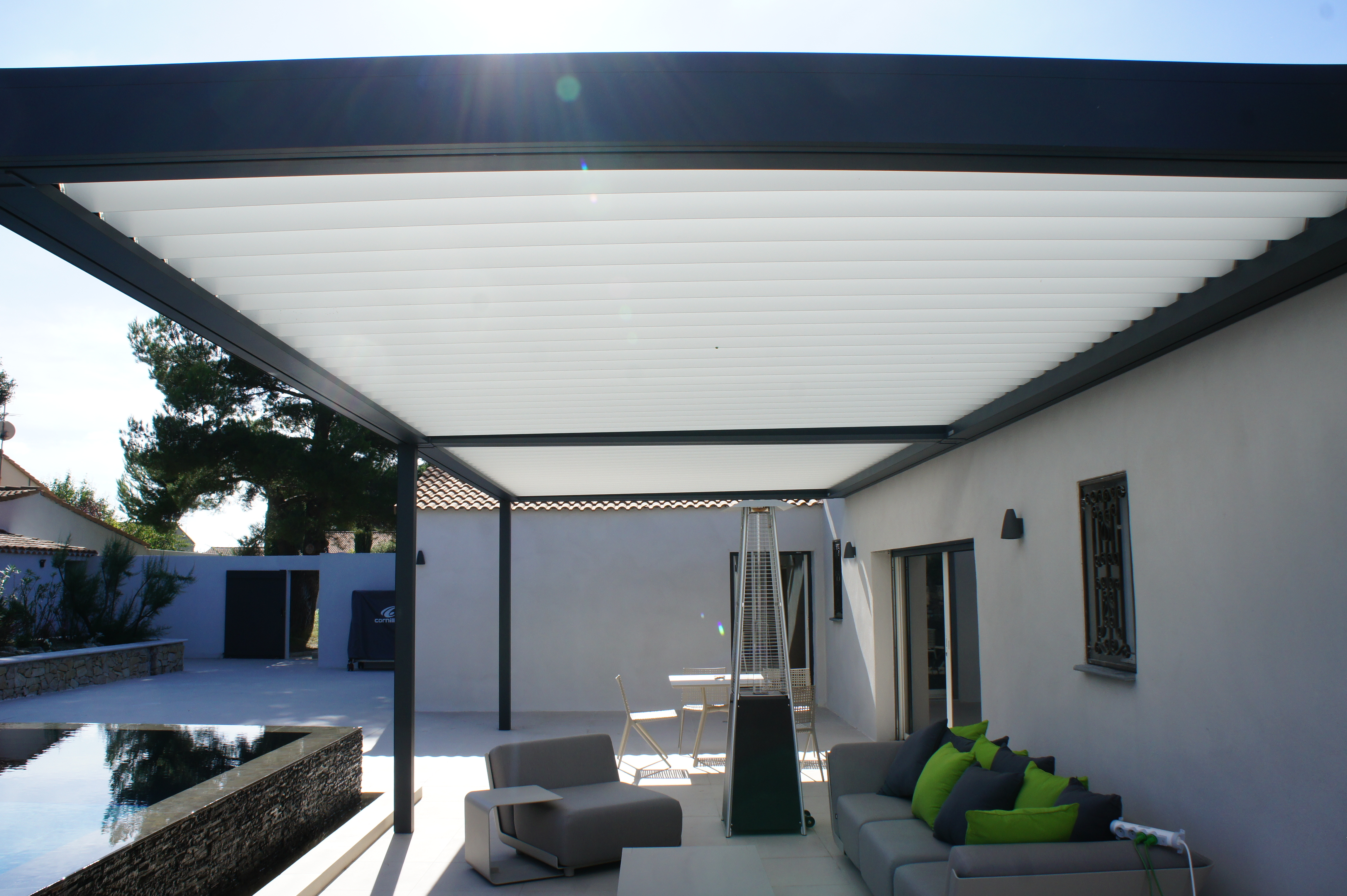 Cette nouvelle pergola permet de se protéger du soleil, mais aussi de la pluie, car lorsque la toile est fermée, la pergola est étanche.